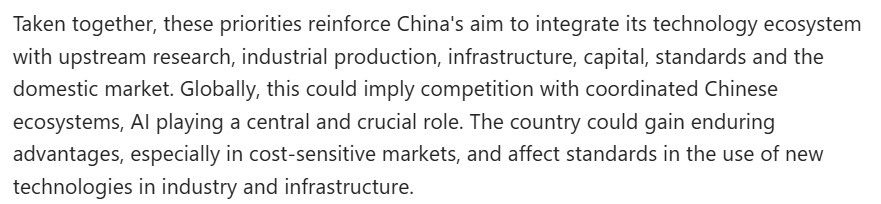 文章進(jìn)一步分析說,這些優(yōu)先事項(xiàng)強(qiáng)化了中國將其技術(shù)生態(tài)系統(tǒng)與上游研究、工業(yè)生產(chǎn)、基礎(chǔ)設(shè)施、資本、標(biāo)準(zhǔn)及國內(nèi)市場相融合的目標(biāo)。對全球而言,這意味著未來將面對一個(gè)高度協(xié)同的中國技術(shù)生態(tài)系統(tǒng),而人工智能將是這一系統(tǒng)的中樞。中國由此可能獲得持久的競爭優(yōu)勢,同時(shí)也會在工業(yè)及基礎(chǔ)設(shè)施的新技術(shù)應(yīng)用標(biāo)準(zhǔn)方面發(fā)揮越來越大的影響力。