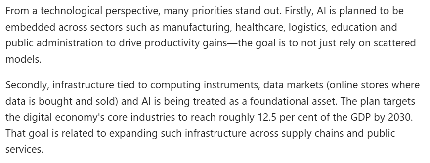 文章認(rèn)為,首先,人工智能被規(guī)劃融入制造業(yè)、醫(yī)療、物流、教育及公共管理等領(lǐng)域,以提升生產(chǎn)力,其目標(biāo)是不再局限于零散的應(yīng)用模式。其次,與計(jì)算設(shè)備、數(shù)據(jù)市場及人工智能相關(guān)的基礎(chǔ)設(shè)施,正被視作一種基礎(chǔ)性資產(chǎn)。規(guī)劃綱要提出,“十五五”時(shí)期數(shù)字經(jīng)濟(jì)核心產(chǎn)業(yè)增加值占國內(nèi)生產(chǎn)總值比重達(dá)到12.5%。這一目標(biāo)與在供應(yīng)鏈及公共服務(wù)領(lǐng)域擴(kuò)展此類基礎(chǔ)設(shè)施密切相關(guān)。