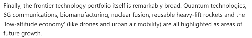文章還注意到,當(dāng)前,中國繼續(xù)要求在科學(xué)技術(shù)等多個(gè)領(lǐng)域取得突破。這意味著,中國需要在整個(gè)技術(shù)體系層面構(gòu)建抗壓能力,而非依賴個(gè)別領(lǐng)域的孤立進(jìn)展。此外,規(guī)劃綱要所涵蓋的前沿技術(shù)領(lǐng)域極為廣泛。量子技術(shù)、第六代移動通信技術(shù)、生物制造、核聚變、可復(fù)用重型運(yùn)載火箭以及“低空經(jīng)濟(jì)”(包括無人機(jī)與城市空中交通)等,均被明確為未來發(fā)展的重點(diǎn)方向。