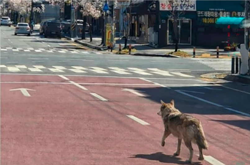 當?shù)貢r間4月8日,大田消防部門提供的照片顯示,這匹在逃狼在大街上行走。圖源:韓媒