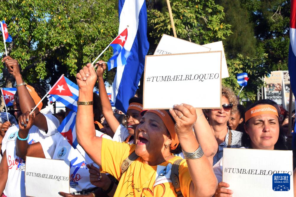4月7日,在古巴首都哈瓦那,婦女們?cè)诩瘯?huì)現(xiàn)場(chǎng)手持“推翻封鎖”的橫幅和古巴國(guó)旗,譴責(zé)美國(guó)對(duì)古封鎖。新華社發(fā)(華金·埃爾南德斯攝)