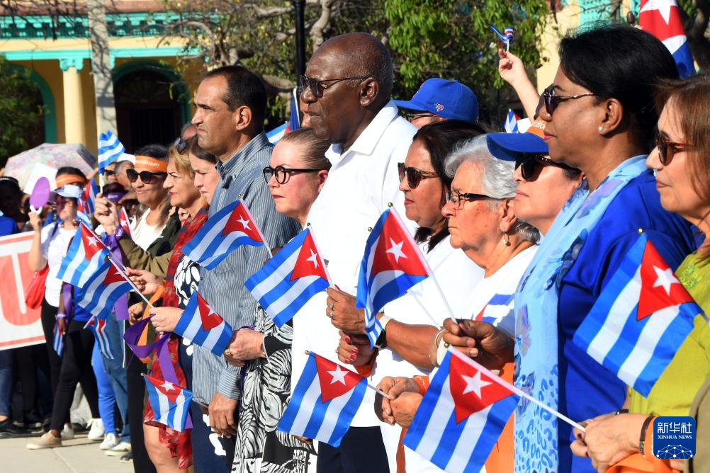 4月7日,古巴首都哈瓦那,古巴國(guó)家副主席薩爾瓦多·梅薩(右六)以及其他古巴黨政機(jī)關(guān)和群眾組織代表出席集會(huì)活動(dòng)。新華社發(fā)(華金·埃爾南德斯攝)
