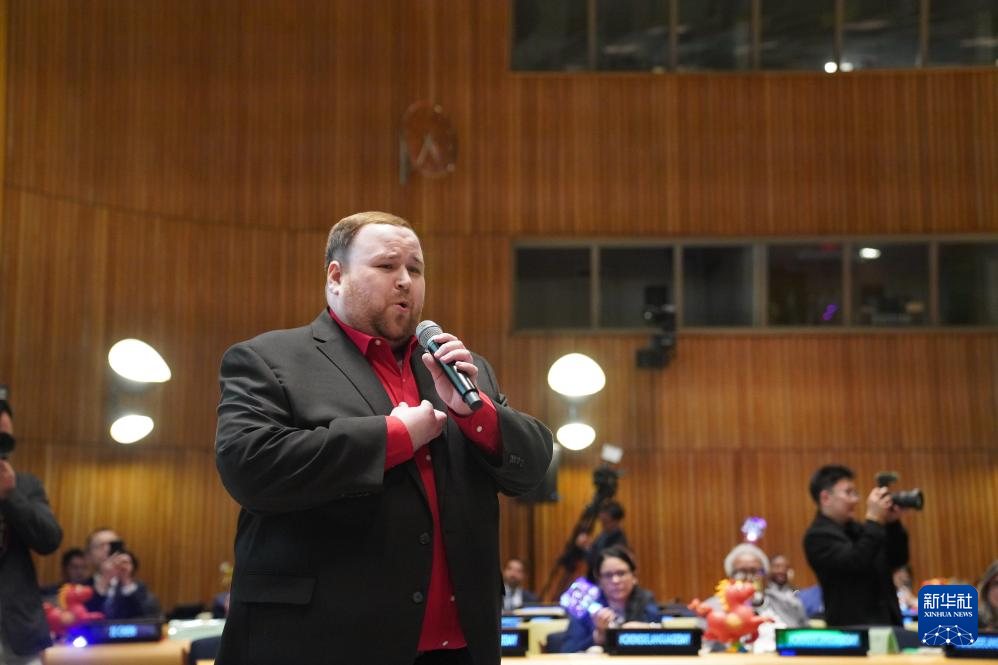 4月13日,在位于紐約的聯(lián)合國(guó)總部,美國(guó)歌唱家在聯(lián)合國(guó)中文日慶祝活動(dòng)上演唱《我愛(ài)你中國(guó)》。 新華社記者 張鳳國(guó) 攝