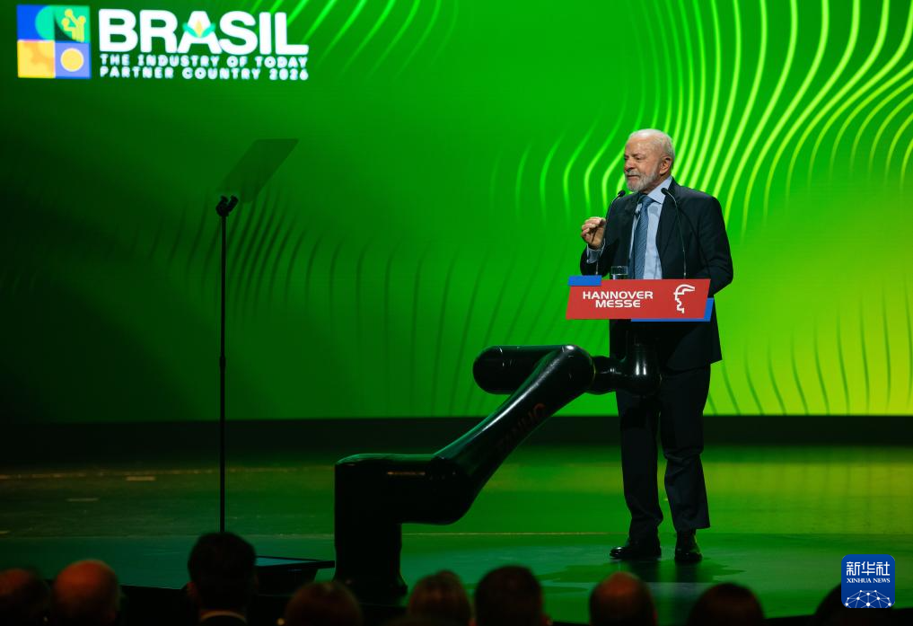 4月19日,主賓國(guó)巴西總統(tǒng)盧拉在德國(guó)漢諾威工業(yè)博覽會(huì)開幕式上致辭。新華社記者 張豪夫 攝
