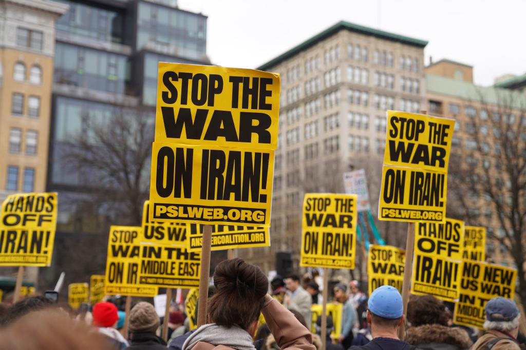 2026年3月7日,人們在美國紐約參加集會游行,抗議美國和以色列對伊朗發(fā)動軍事打擊。新華社記者張鳳國攝