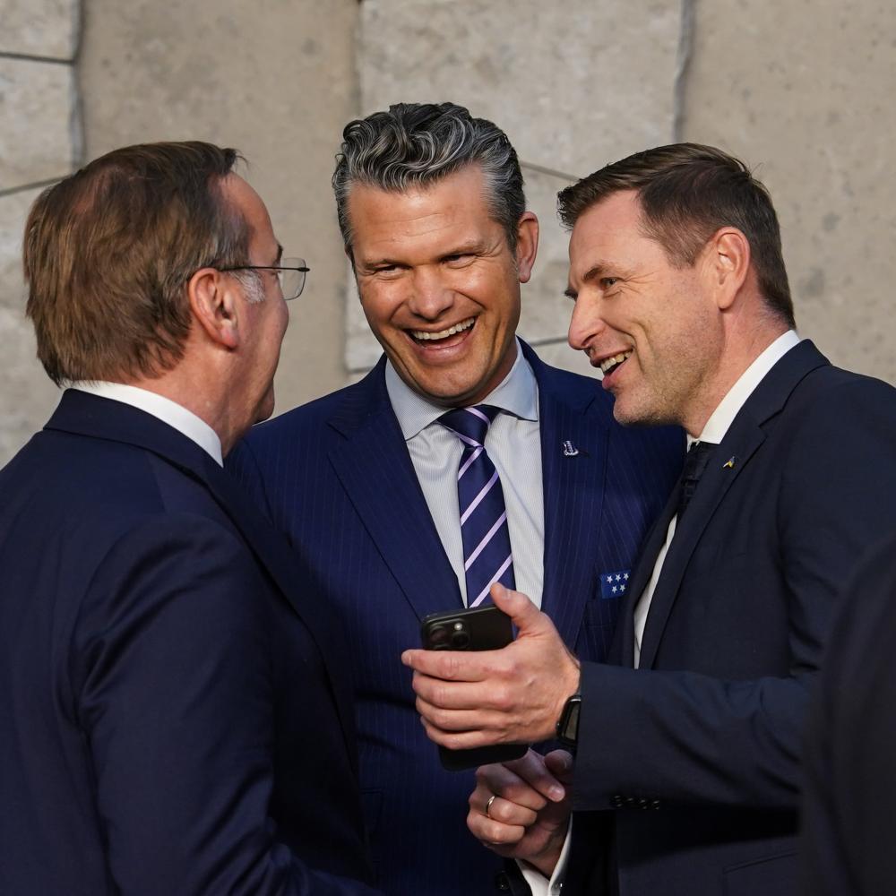 2025年10月15日,在比利時布魯塞爾舉行的北約防長會議結(jié)束后,美國國防部長赫格塞思(中)與愛沙尼亞國防部長佩夫庫爾(右)、德國國防部長皮斯托里烏斯交談。新華社記者彭子洋攝