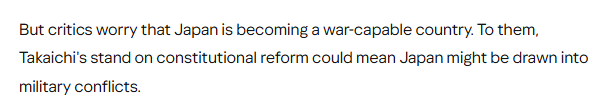文章認(rèn)為,日本首相高市早苗一直支持修改和平憲法。雖然她尚未明確說明具體修改內(nèi)容,但許多人認(rèn)為這將涉及修改放棄戰(zhàn)爭的憲法第九條。批評人士擔(dān)心日本正朝著成為一個(gè)具備戰(zhàn)爭能力的國家邁進(jìn)。高市早苗在憲法改革問題上的立場可能意味著日本將介入軍事沖突。