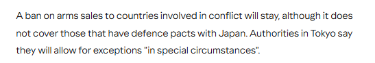 文章分析稱,此前將武器出口限制在救援、運(yùn)輸、預(yù)警、監(jiān)視和掃雷這五類裝備的規(guī)定將被取消。這意味著日本現(xiàn)在可以向包括美國和英國在內(nèi)的17個(gè)與其簽訂防務(wù)協(xié)定的國家出售殺傷性武器。對參與沖突的國家實(shí)施武器出口的禁令將繼續(xù)保留,但該禁令不適用于與日本有防務(wù)協(xié)定的國家。日本政府表示,將在“特殊情況下”允許例外處理。