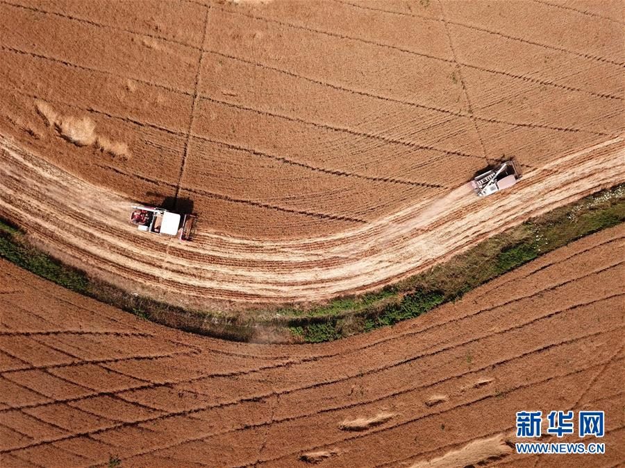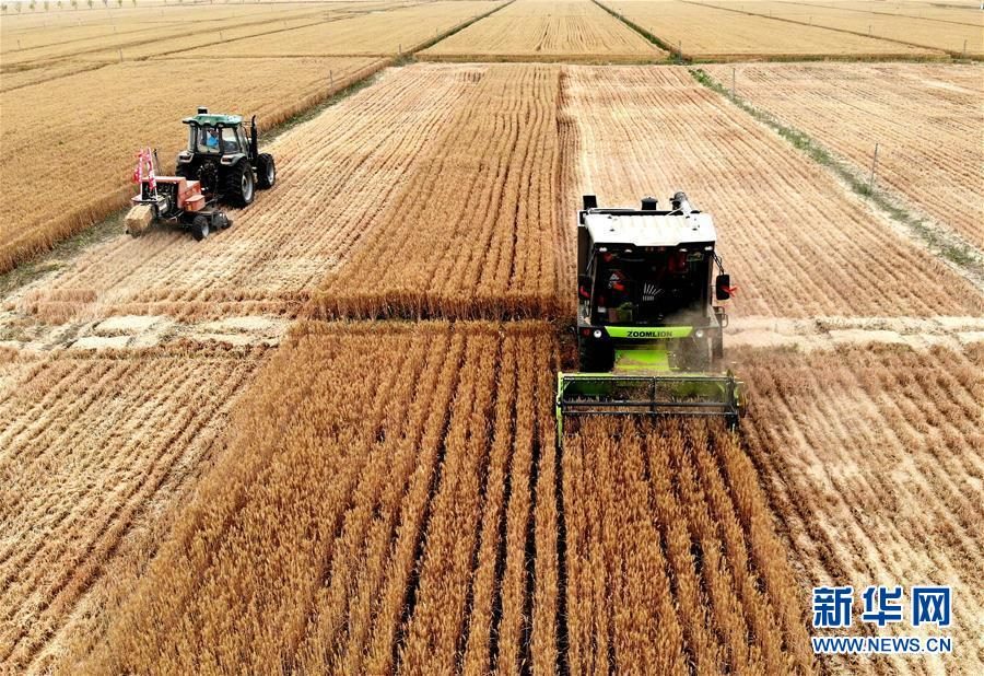 5月29日,在河南省商水縣南陵村的一處麥田里,農(nóng)機(jī)手操作收割機(jī)和小麥秸稈打捆機(jī)(無(wú)人機(jī)照片)。眼下,“中原糧倉(cāng)”河南迎來(lái)豐收季,各地農(nóng)民搶抓農(nóng)時(shí)收割小麥。截至5月29日17時(shí),全省已收獲小麥3315萬(wàn)畝,日投入聯(lián)合收割機(jī)7.8萬(wàn)臺(tái)。新華社記者李安攝