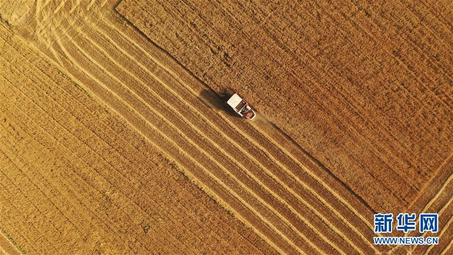 6月2日,在江蘇省淮安市洪澤區(qū),農(nóng)民駕駛農(nóng)機(jī)收割小麥(無(wú)人機(jī)照片)。 “三夏”時(shí)節(jié),麥浪滾滾。農(nóng)民在田間加緊搶收,確保小麥顆粒歸倉(cāng)。新華社發(fā)(陳凱攝)