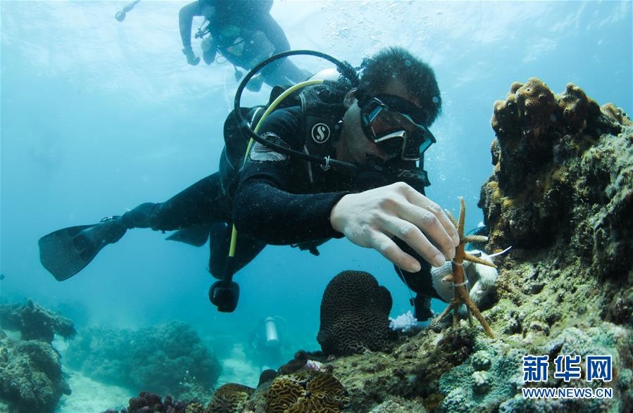 在海南三亞蜈支洲島海域,中科院南海海洋研究所副研究員張浴陽團隊工作人員在海底的移植釘上固定珊瑚(4月28日攝)。新華社記者楊冠宇攝