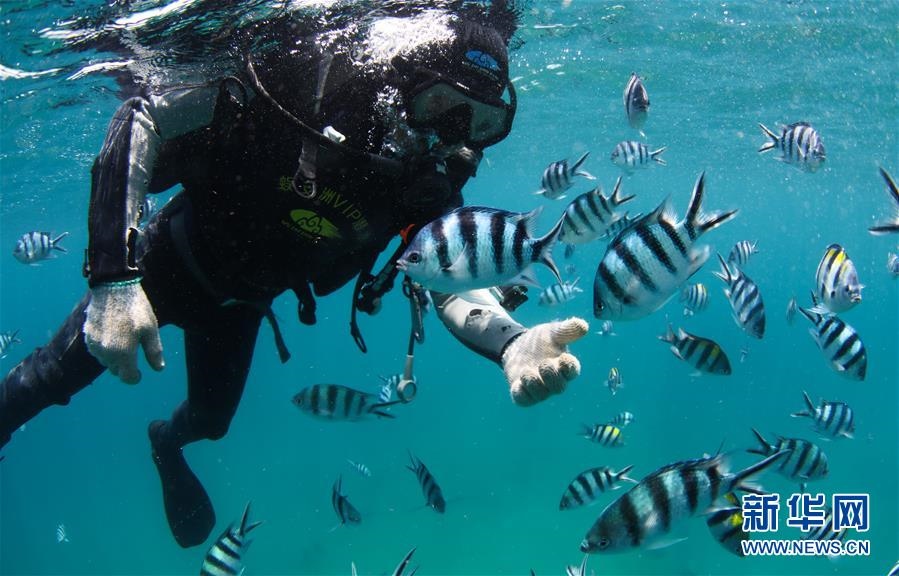 在海南三亞蜈支洲島海域拍攝的與??采男〕篝~(5月28日攝)。海南省三亞蜈支洲島海域海洋牧場是海南首個國家級海洋牧場示范區(qū),也是中國第一個位于熱帶地區(qū)的海洋牧場。近年來,蜈支洲島海域海洋牧場推進海洋生態(tài)系統(tǒng)的恢復和保護,先后開展了人工魚礁投放、海洋環(huán)境修復、珊瑚移植等工作。截至2019年底,蜈支洲島海域海洋牧場共投放各類人工魚礁1526塊、船礁21艘和一批火山石礁,共達4萬空立方米,礁區(qū)海域的漁業(yè)資源比非礁區(qū)要高5倍以上。目前,蜈支洲島海域海洋牧場已初現(xiàn)雛形。新華社記者楊冠宇攝