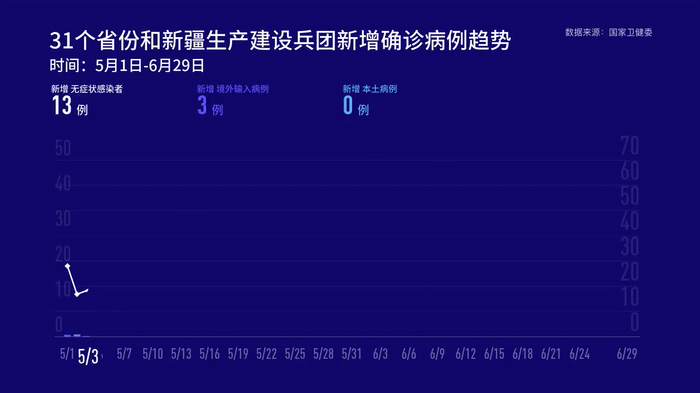 6月29日0—24時(shí),31個(gè)省(自治區(qū)、直轄市)和新疆生產(chǎn)建設(shè)兵團(tuán)報(bào)告新增確診病例19例,其中境外輸入病例11例(廣東4例,上海3例,四川3例,甘肅1例),本土病例8例(北京7例,上海1例);無(wú)新增死亡病例;新增疑似病例1例,為境外輸入病例(在上海)。