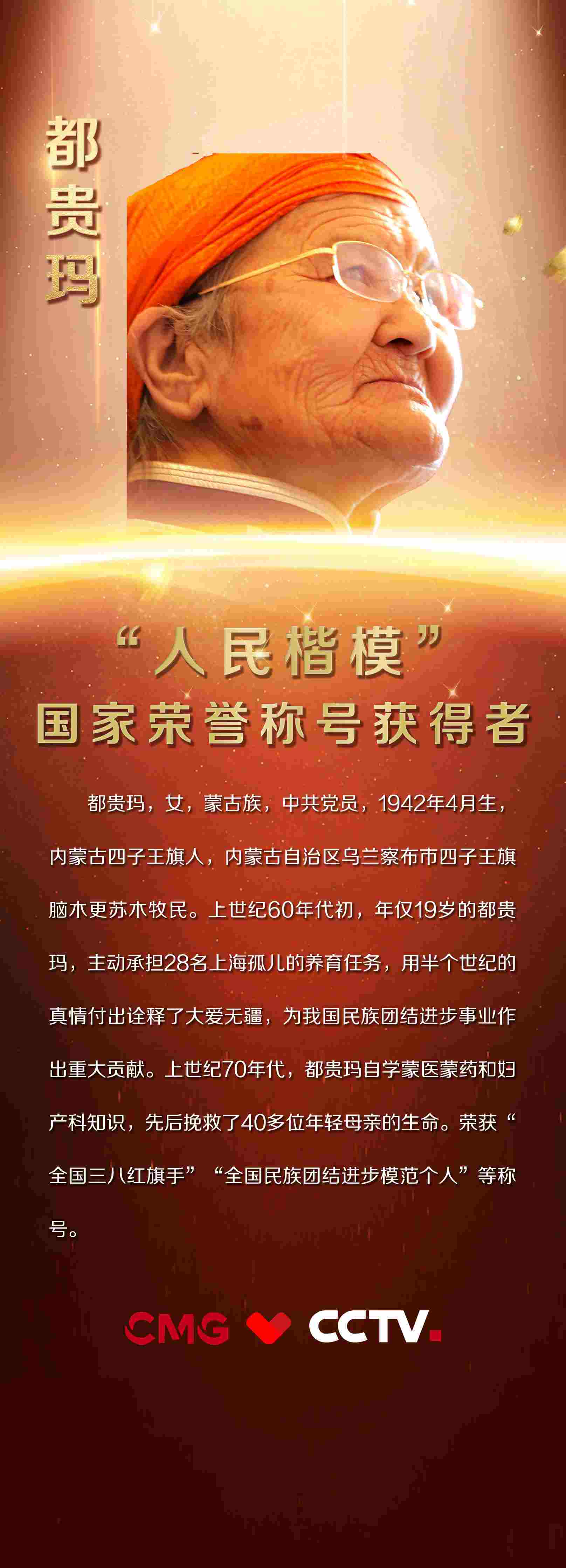 都貴瑪,女,蒙古族,中共黨員,1942年4月生,內(nèi)蒙古四子王旗人,內(nèi)蒙古自治區(qū)烏蘭察布市四子王旗腦木更蘇木牧民。上世紀(jì)60年代初,年僅19歲的都貴瑪,主動(dòng)承擔(dān)28名上海孤兒的養(yǎng)育任務(wù),用半個(gè)世紀(jì)的真情付出詮釋了大愛(ài)無(wú)疆,為我國(guó)民族團(tuán)結(jié)進(jìn)步事業(yè)作出重大貢獻(xiàn)。上世紀(jì)70年代,都貴瑪自學(xué)蒙醫(yī)蒙藥和婦產(chǎn)科知識(shí),先后挽救了40多位年輕母親的生命。榮獲“全國(guó)三八紅旗手”“全國(guó)民族團(tuán)結(jié)進(jìn)步模范個(gè)人”等稱號(hào)。