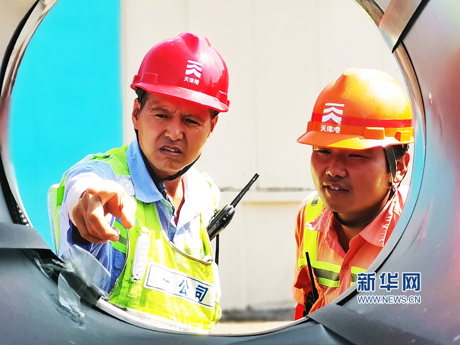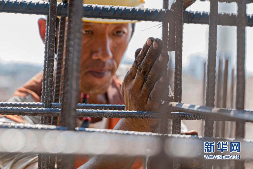 天津港航建設工人冒著酷暑在天津港c段碼頭建設現(xiàn)場檢查鋼筋情況。新華網(wǎng)發(fā)