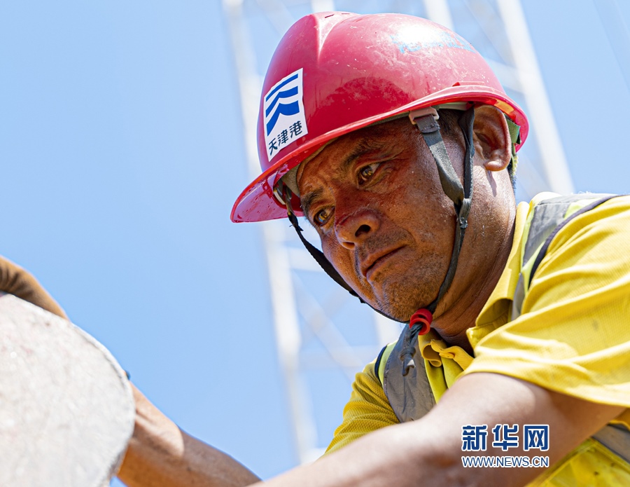 烈日下,建設工人在天津港c段智能化集裝箱碼頭建設現(xiàn)場進行安裝樁體工作。新華網(wǎng)發(fā)