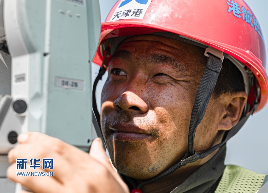 建設工人冒著酷暑在天津港C段智能化集裝箱碼頭建設現(xiàn)場做測量工作。新華網(wǎng)發(fā)