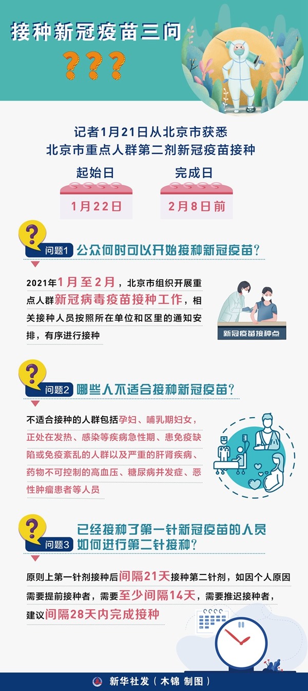 公眾何時(shí)可以接種新冠肺炎疫苗?哪些人不適合接種?如何進(jìn)行第二劑接種?北京市有關(guān)專家進(jìn)行了解答。