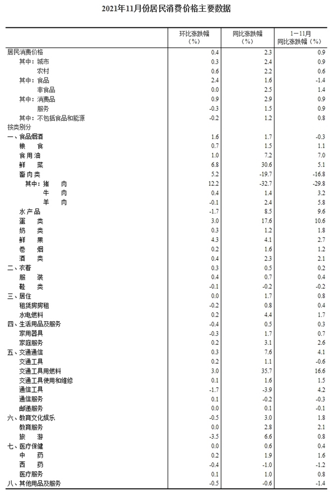 據(jù)國家統(tǒng)計局網(wǎng)站消息,2021年11月份,全國居民消費價格同比上漲2.3%。其中,城市上漲2.4%,農(nóng)村上漲2.2%;食品價格上漲1.6%,非食品價格上漲2.5%;消費品價格上漲2.9%,服務價格上漲1.5%。1—11月平均,全國居民消費價格比上年同期上漲0.9%。