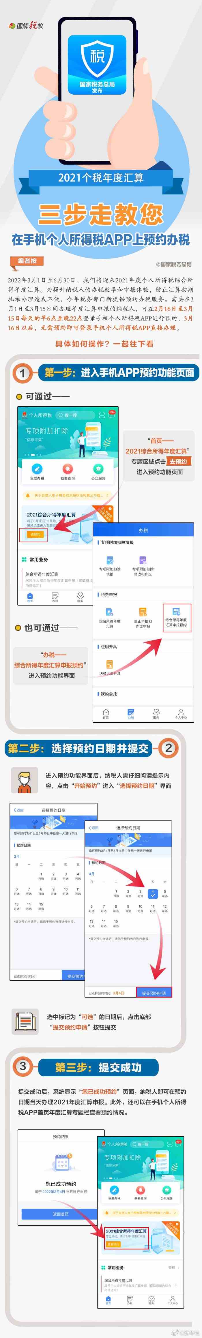 2022年3月1日至6月30日,我們將迎來2021年度個人所得稅綜合所得年度匯算。為提升納稅人的辦稅效率和申報體驗,今年稅務(wù)部門新提供預(yù)約辦稅服務(wù)。如何通過個人所得稅APP進(jìn)行預(yù)約辦稅?很簡單,三步走,手把手教你輕松搞定,看圖了解↓(記者 王雨蕭;圖片來源:國家稅務(wù)總局)