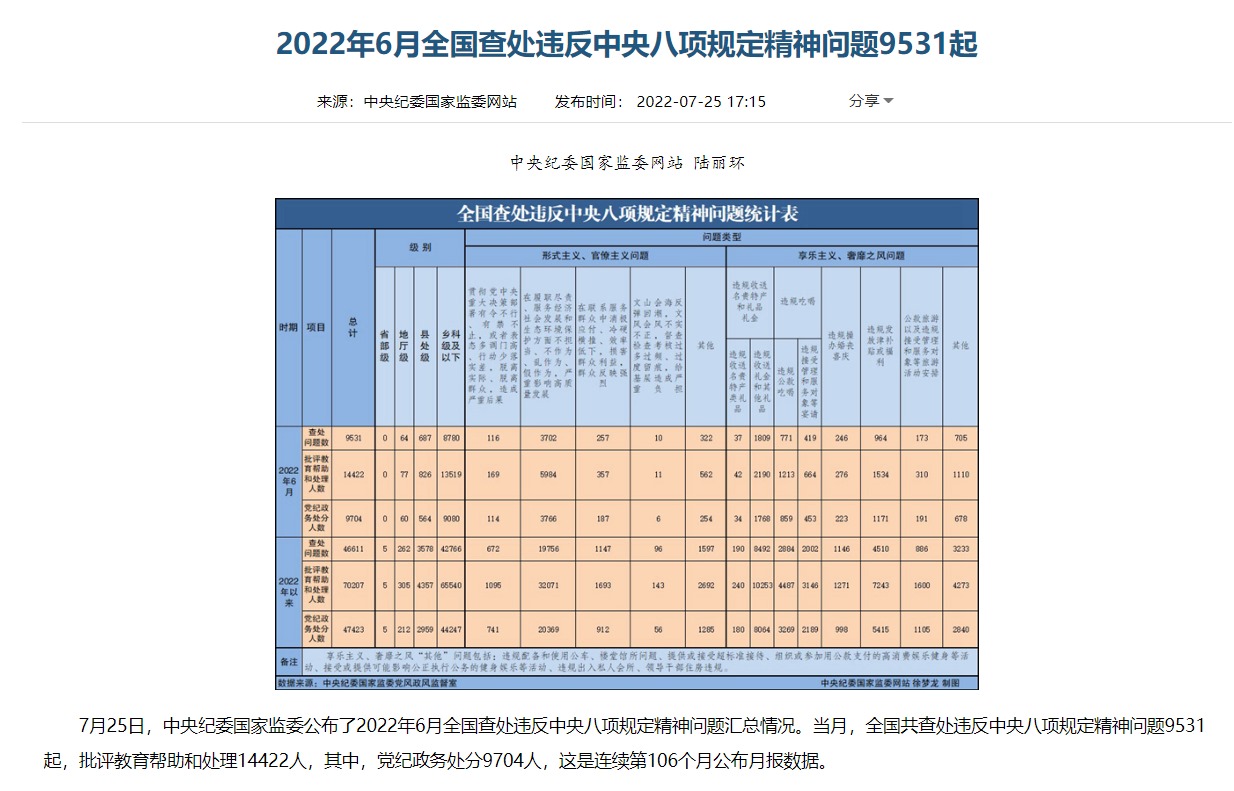 中國共產(chǎn)黨新聞網(wǎng)北京7月25日電(彭靜)7月25日,中央紀(jì)委國家監(jiān)委在其官方網(wǎng)站公布了2022年6月全國查處違反中央八項(xiàng)規(guī)定精神問題匯總情況,這是連續(xù)第106個(gè)月公布月報(bào)數(shù)據(jù)。