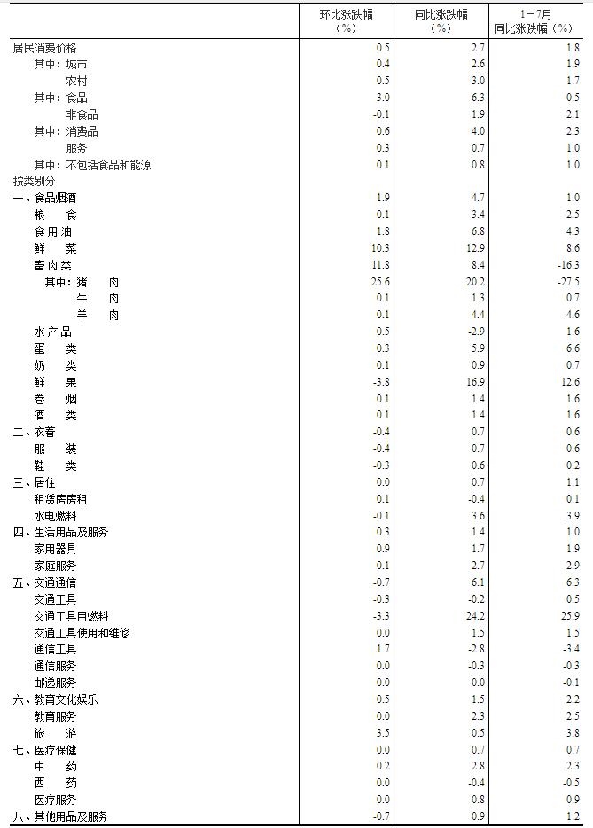 7月份,全國居民消費(fèi)價(jià)格環(huán)比上漲0.5%。其中,城市上漲0.4%,農(nóng)村上漲0.5%;食品價(jià)格上漲3.0%,非食品價(jià)格下降0.1%;消費(fèi)品價(jià)格上漲0.6%,服務(wù)價(jià)格上漲0.3%。