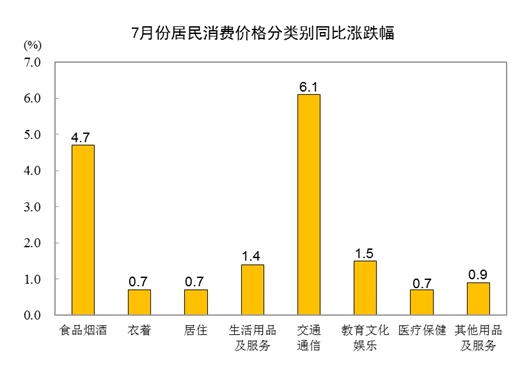 7月份,食品煙酒類價(jià)格同比上漲4.7%,影響CPI(居民消費(fèi)價(jià)格指數(shù))上漲約1.28個(gè)百分點(diǎn)。食品中,鮮果價(jià)格上漲16.9%,影響CPI上漲約0.30個(gè)百分點(diǎn);鮮菜價(jià)格上漲12.9%,影響CPI上漲約0.24個(gè)百分點(diǎn);畜肉類價(jià)格上漲8.4%,影響CPI上漲約0.27個(gè)百分點(diǎn),其中豬肉價(jià)格上漲20.2%,影響CPI上漲約0.27個(gè)百分點(diǎn);蛋類價(jià)格上漲5.9%,影響CPI上漲約0.04個(gè)百分點(diǎn);糧食價(jià)格上漲3.4%,影響CPI上漲約0.06個(gè)百分點(diǎn);水產(chǎn)品價(jià)格下降2.9%,影響CPI下降約0.06個(gè)百分點(diǎn)。