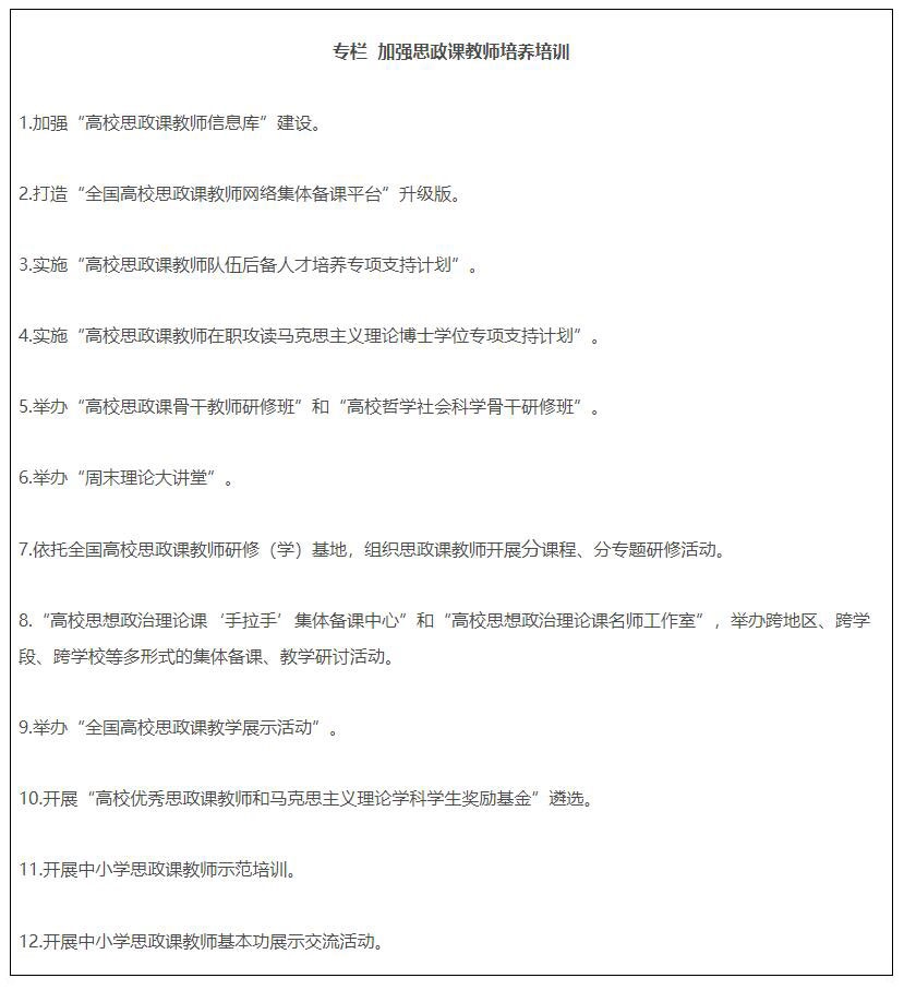 19.全面推進(jìn)課程思政高質(zhì)量建設(shè)。教育部組建高等學(xué)校課程思政教學(xué)指導(dǎo)委員會(huì),研制普通本科專業(yè)類課程思政教學(xué)指南,組織開(kāi)展高校教師課程思政教學(xué)能力培訓(xùn),建設(shè)一批課程思政系列共享資源庫(kù)。建成一批課程思政示范高校,推出一批課程思政示范課程,選樹(shù)一批課程思政教學(xué)名師和團(tuán)隊(duì),建設(shè)一批高校課程思政教學(xué)研究示范中心。加強(qiáng)中小學(xué)學(xué)科德育建設(shè)。