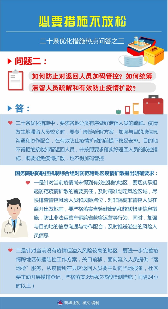 答:二十條優(yōu)化措施中,要求各地分類有序做好滯留人員的疏解。疫情發(fā)生地滯留人員較多時,要專門制定疏解方案,加強與目的地信息溝通和協(xié)作配合,在有效防止疫情擴(kuò)散的前提下穩(wěn)妥安排。目的地不得拒絕接收滯留返回人員,并按照要求落實好返回人員的防控措施,既要避免疫情擴(kuò)散,也不得加碼管控。
