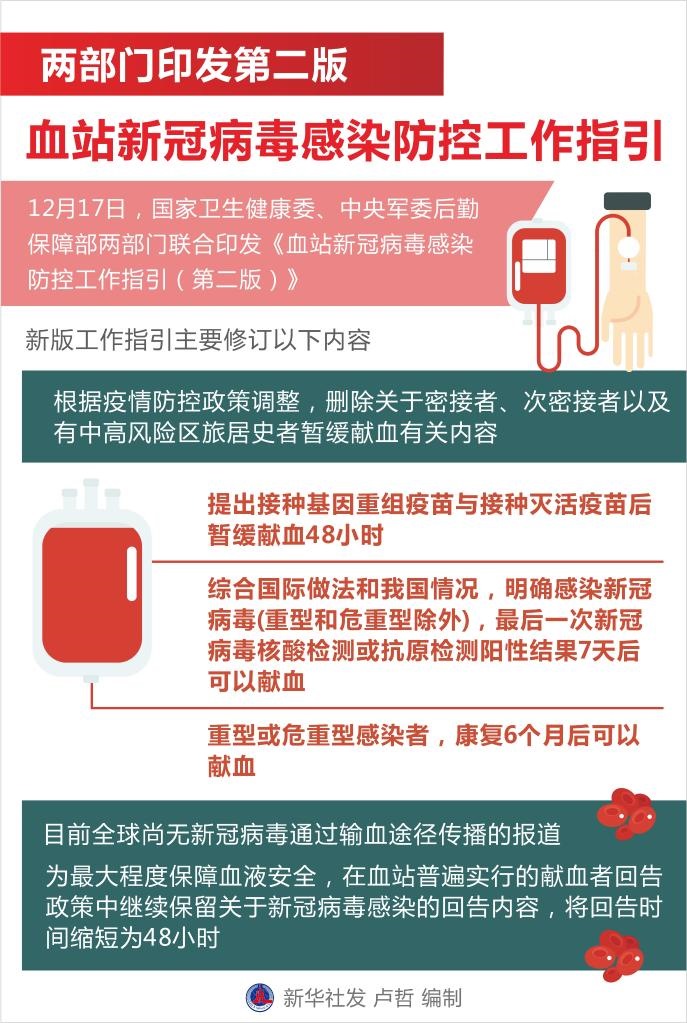 新華社北京12月17日電(記者顧天成、董瑞豐)血站新冠病毒感染防控工作事關血液安全平穩(wěn)供應。17日,國家衛(wèi)生健康委、中央軍委后勤保障部兩部門聯(lián)合印發(fā)《血站新冠病毒感染防控工作指引(第二版)》,指導采供血機構(gòu)切實做好新形勢下疫情防控工作,保障血站工作人員和獻血者安全,實現(xiàn)血液安全供應。