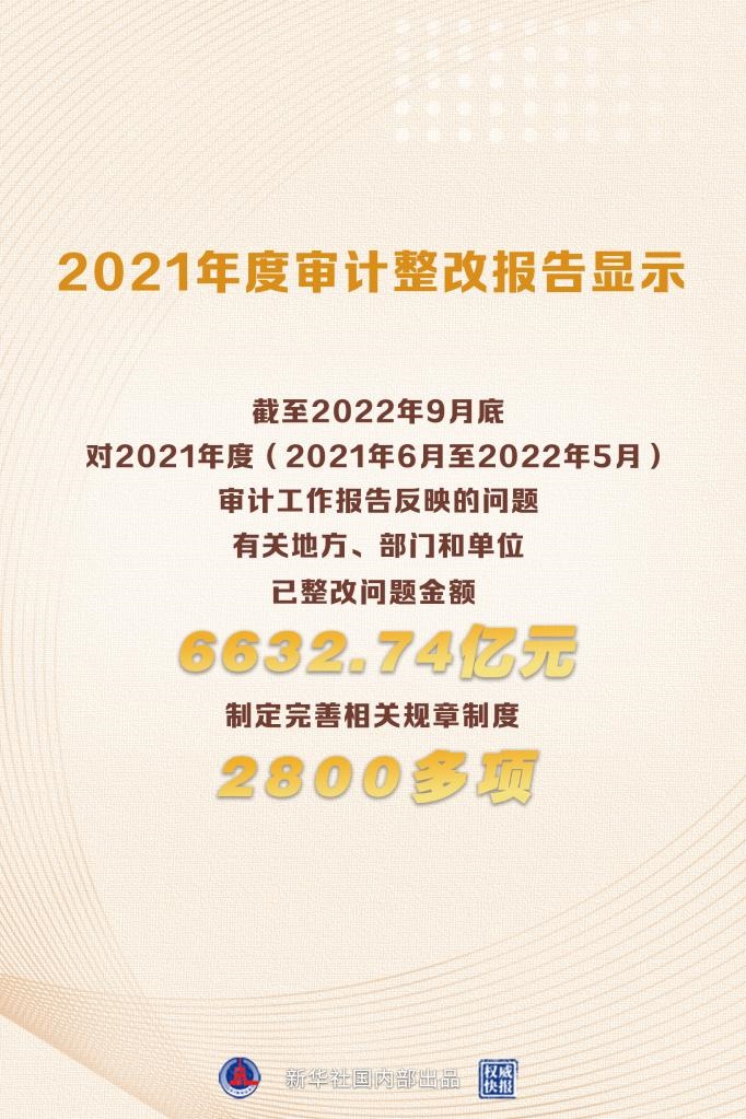 新華社北京12月28日電(記者鄒多為)報(bào)告顯示,截至2022年9月底,對(duì)于2021年度(2021年6月至2022年5月)審計(jì)工作報(bào)告反映的問(wèn)題,有關(guān)地方、部門(mén)和單位已整改問(wèn)題金額6632.74億元,制定完善相關(guān)規(guī)章制度2800多項(xiàng),追責(zé)問(wèn)責(zé)1.4萬(wàn)人,糾治了一些阻礙改革發(fā)展和長(zhǎng)期未解決的頑瘴痼疾。
