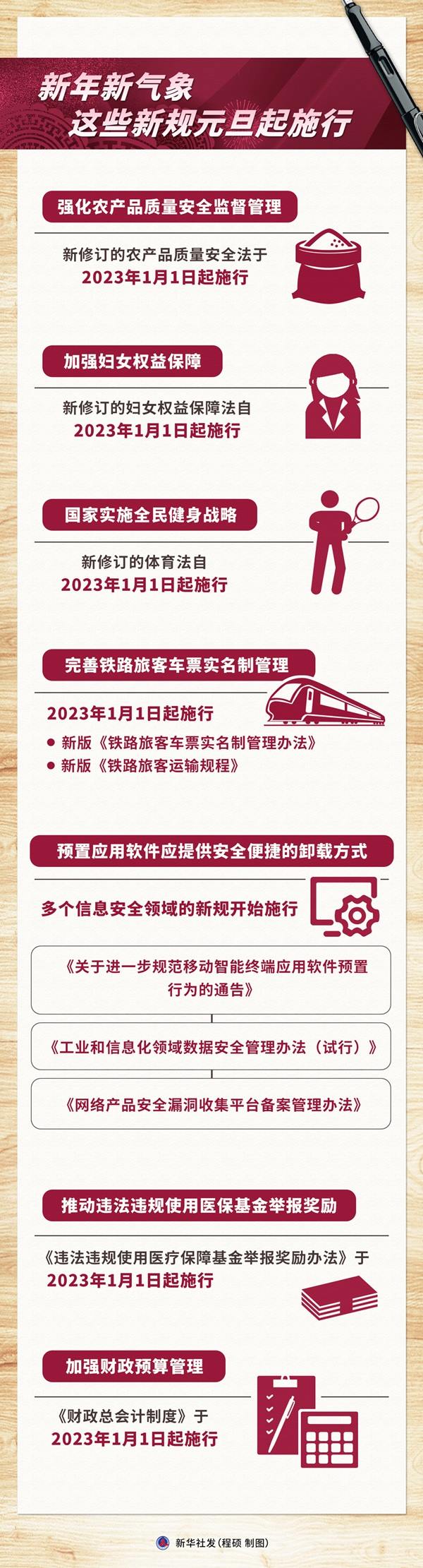 當(dāng)2023年的鐘聲敲響,一批元旦起施行的新規(guī),將為我們帶來新年新氣象。新修訂的農(nóng)產(chǎn)品質(zhì)量安全法全鏈條保障“舌尖上的安全”;新修訂的婦女權(quán)益保障法進(jìn)一步促進(jìn)男女平等;新修訂的體育法構(gòu)建全民健身公共服務(wù)體系……法治的溫度,彰顯社會(huì)的進(jìn)步。