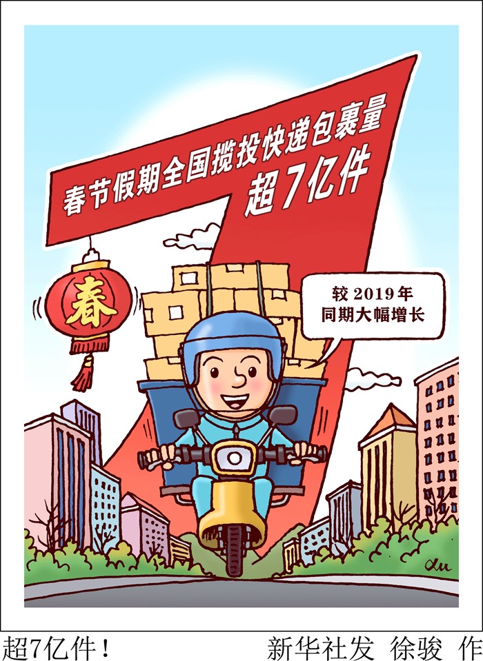 新華社北京1月28日電(記者戴小河)國家郵政局監(jiān)測數據顯示,1月21日至27日春節(jié)假期期間,全國郵政快遞業(yè)攬收快遞包裹約4.1億件,與去年春節(jié)假期相比增長5.1%,較2019年春節(jié)假期增長192.9%;投遞快遞包裹3.3億件,與去年春節(jié)假期相比增長10.0%,較2019年春節(jié)假期增長254.8%。