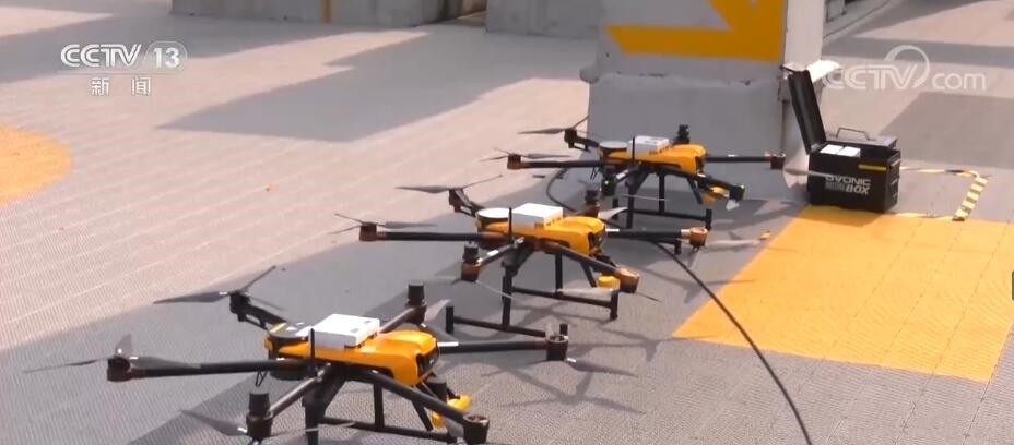 中午11點(diǎn),在深圳一家商場頂層的平臺(tái)上,一架架無人機(jī)整齊停放在“停機(jī)坪”,工作人員將傳送帶上的外賣掃碼、裝箱,再掛上無人機(jī)就準(zhǔn)備起飛。在幾公里外的目的地,有智能空投柜等待接收,降落后顧客憑取件碼取餐,方便安全。