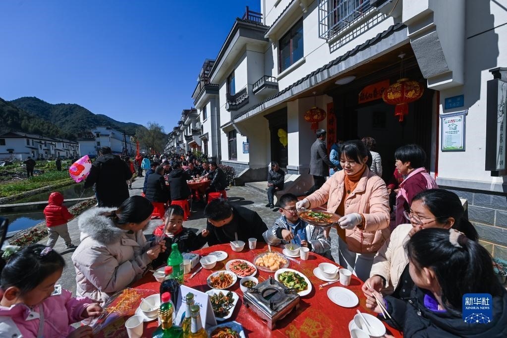 游客在浙江省建德市蓮花鎮(zhèn)戴家新村的百家宴上品嘗特色美食,感受新農村“舌尖上的幸?!保?023年2月26日攝)。新華社記者 徐昱 攝