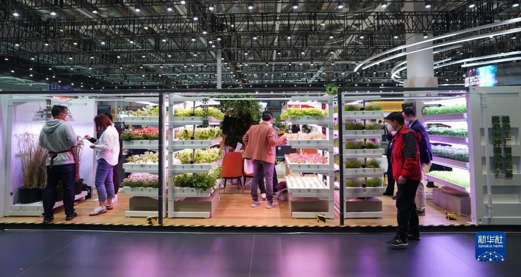 觀眾在第五屆進博會食品及農產品展區(qū)參觀集裝箱植物工廠的模型(2022年11月7日攝)。新華社記者 劉穎 攝