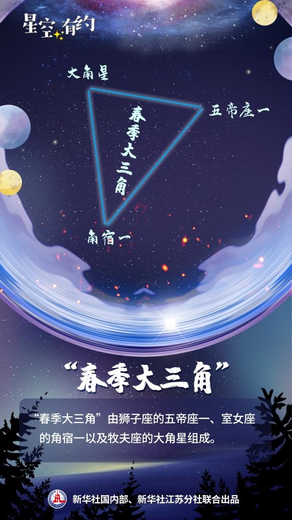 3月天黑后,“春季大三角”會從東方緩緩升起。其中,大角星是春夜星空的第一亮星,角宿一則是代表“二月二,龍?zhí)ь^”的一顆“龍頭星”。