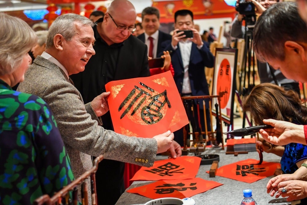 ↑2023年1月20日,來(lái)賓在俄羅斯莫斯科舉行的“歡樂(lè)春節(jié)—中國(guó)文化廟會(huì)”活動(dòng)上接到福字。中俄兩國(guó)人文交流日益密切,中俄友好社會(huì)民意基礎(chǔ)愈加穩(wěn)固。