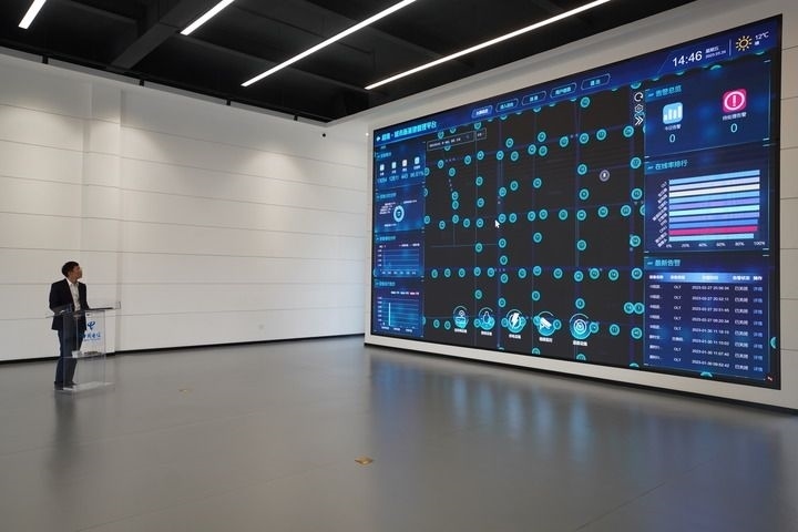 河北雄安新區(qū)中國電信智慧城市產(chǎn)業(yè)園的工作人員展示數(shù)字道路運(yùn)營系統(tǒng)(3月24日攝)。