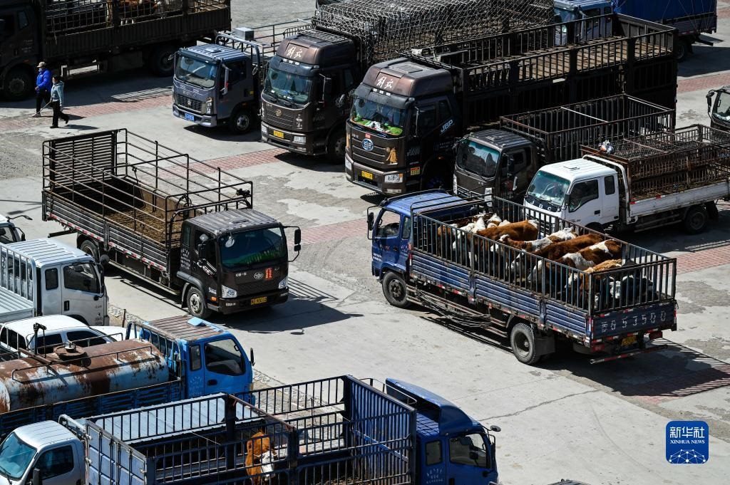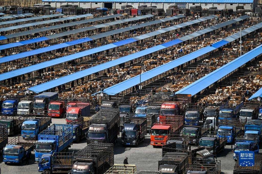 4月12日,內蒙古通遼市科爾沁左翼中旗舍伯吐鎮(zhèn)成峰牲畜交易市場里一片繁忙景象,1000余輛貨運車整齊排列,1萬余頭黃牛正等待被交易。據介紹,這個交易市場年交易80萬頭肉牛,交易額可達80億元。今年以來,當地牛市行情逐漸轉好,來自遼寧、吉林、山東等地的買家再次聚集于此,帶動了養(yǎng)殖戶增收。新華社記者 連振 攝