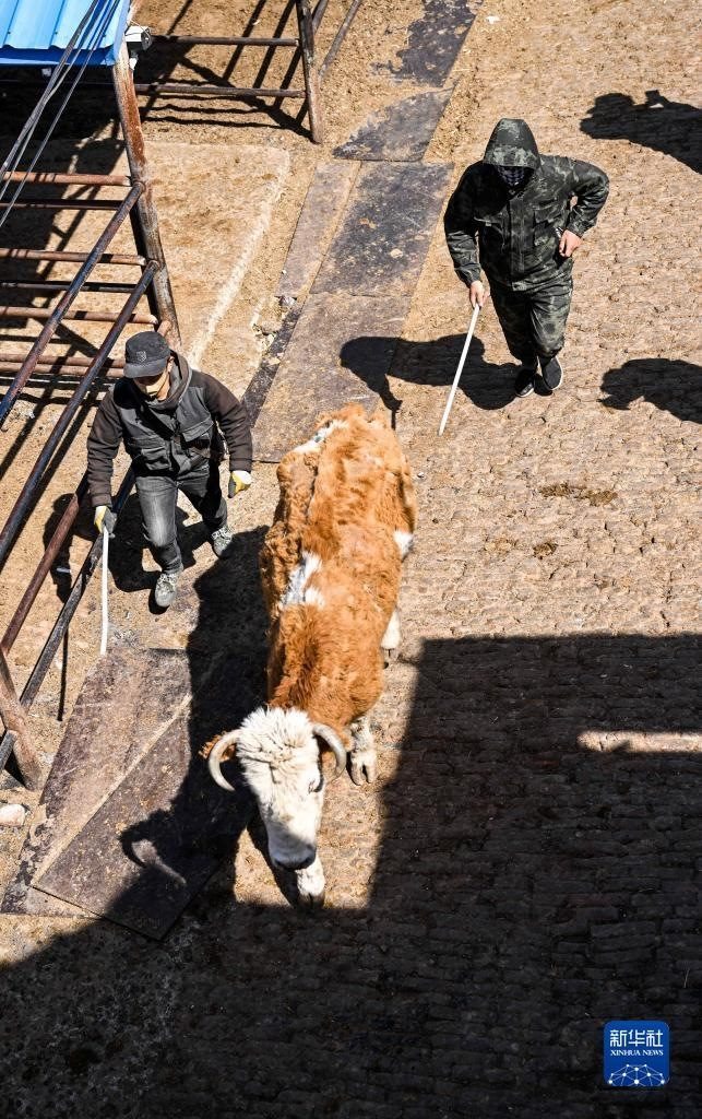 4月12日,賣家在成峰牲畜交易市場趕牛。
