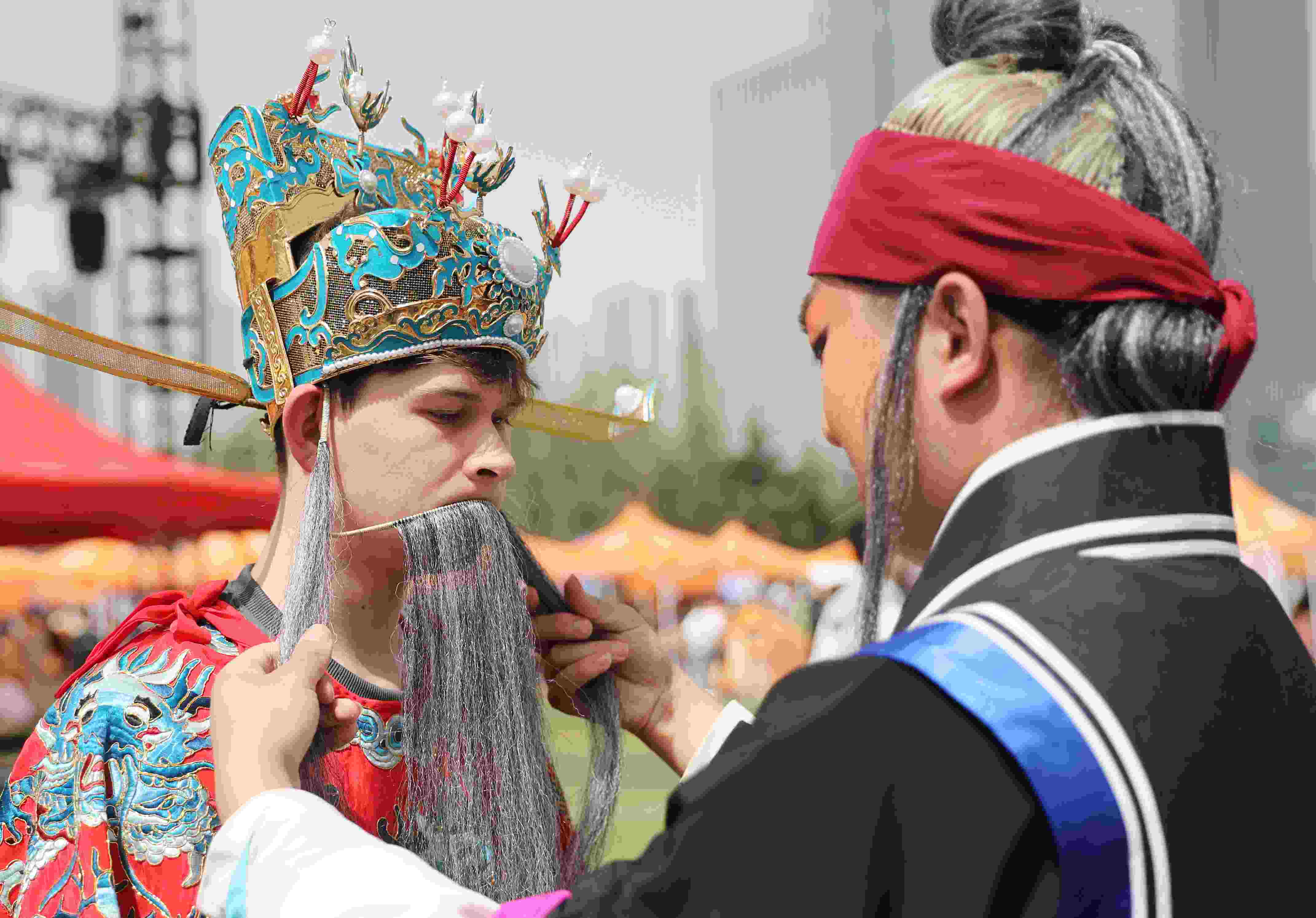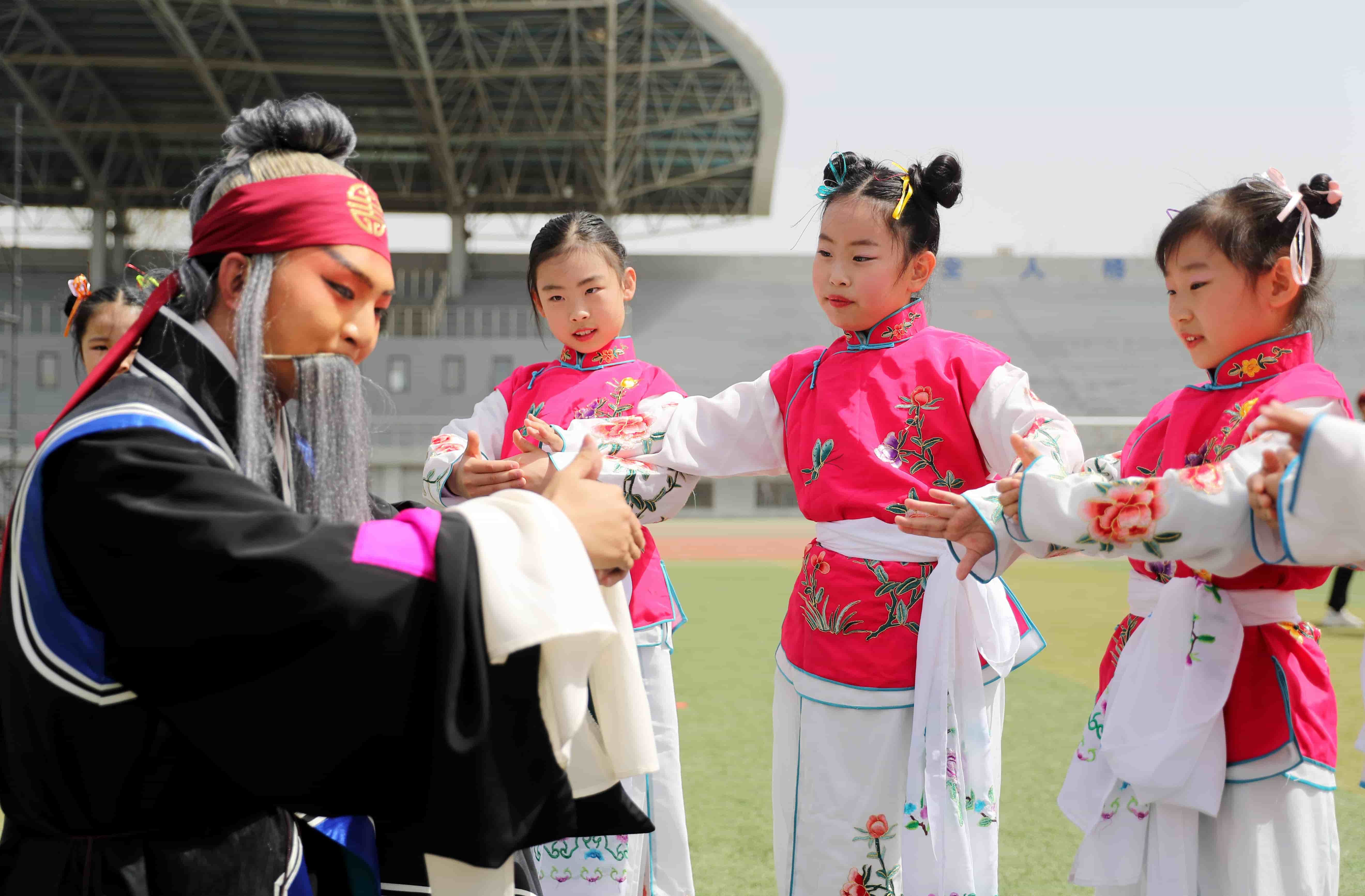 4月15日,山東青島,中國(guó)石油大學(xué)(華東)韻遠(yuǎn)京劇隊(duì)的同學(xué)們聯(lián)合青島西海岸新區(qū)珠江路小學(xué)的小學(xué)生們?cè)诖髮W(xué)校園里上演了一堂生動(dòng)的戲曲普及課。