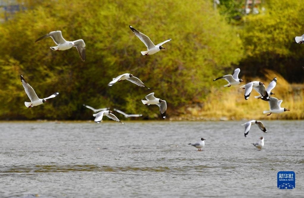 棕頭鷗在拉薩河上嬉戲(4月16日攝)。