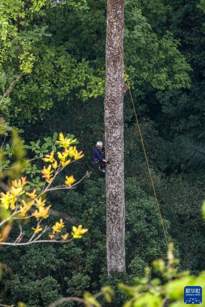 3月15日,南寧藍(lán)天救援隊(duì)的黃賢銘在攀爬望天樹,準(zhǔn)備安裝測(cè)量樹高的超聲波信標(biāo)。