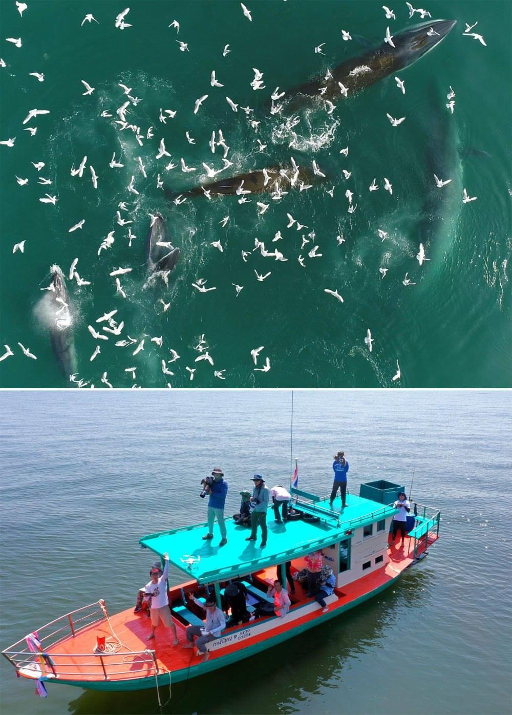 (拼版照片)上圖:布氏鯨在中國廣西潿洲島附近海域捕食(2022年2月22日攝)。下圖:中泰兩國科研人員在泰國灣對布氏鯨進行聯(lián)合調(diào)查(2019年10月25日攝)。中泰兩國科研人員攜手研究保護布氏鯨這個近岸大型鯨類,圍繞布氏鯨調(diào)查技術、調(diào)查方法以及其他海洋哺乳動物的研究和數(shù)據(jù)處理方法進行交流與合作。