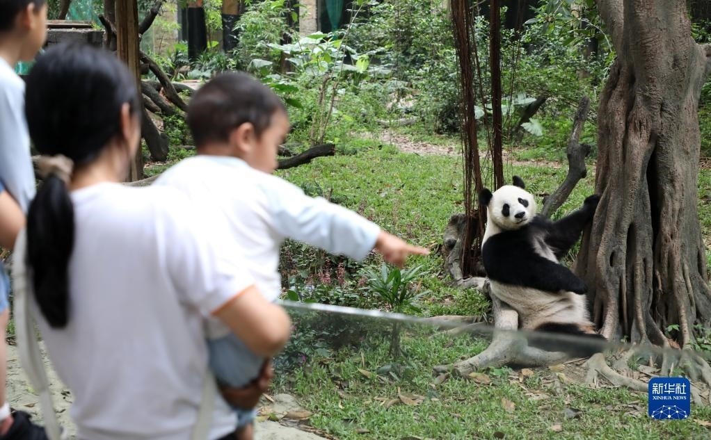 4月29日,在廣東廣州長(zhǎng)隆野生動(dòng)物世界,游客在觀賞大熊貓。