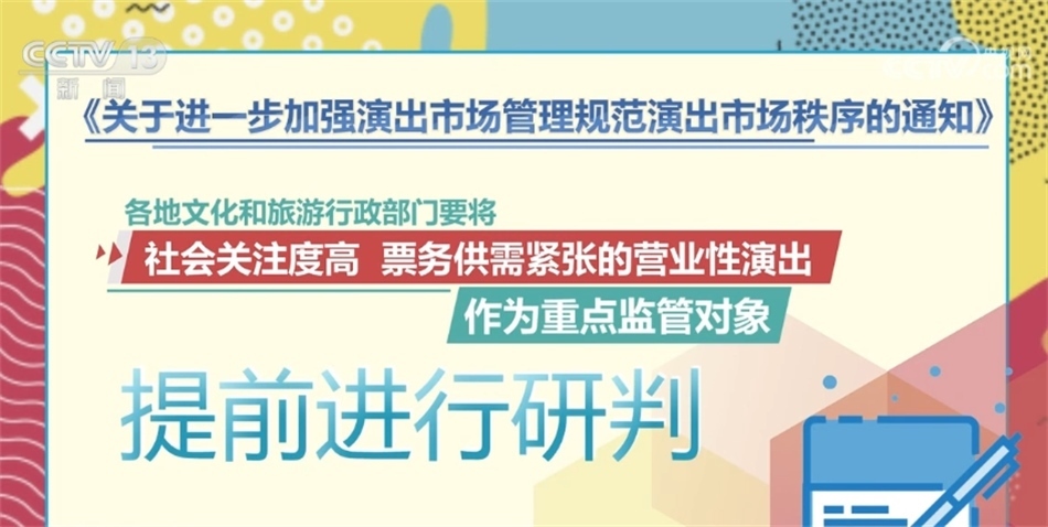 通知指出,各地文化和旅游行政部門要依法做好演出活動的審批工作,將屬于營業(yè)性演出范圍的農(nóng)村集鎮(zhèn)演出、流動性演出納入審批管理,嚴格審核演出舉辦單位的資質(zhì)文件,統(tǒng)一審批要求,做好內(nèi)容監(jiān)管。對不符合法定審批要求的,堅決不予批準。文化和旅游行政部門要定期對演出場所進行檢查,督促演出場所定期開展設(shè)施設(shè)備檢查,落實安全生產(chǎn)責任制。督促演出場所建立完善現(xiàn)場巡查制度,指定專人負責演出活動的巡查,做好現(xiàn)場觀眾管理,堅決防止擁擠、踩踏等事故發(fā)生,確保演出現(xiàn)場安全。各地文化和旅游行政部門要將社會關(guān)注度高、票務(wù)供需緊張的營業(yè)性演出作為重點監(jiān)管對象,提前進行研判。督促演出舉辦單位、演出票務(wù)經(jīng)營單位面向市場公開銷售的營業(yè)性演出門票數(shù)量,不得低于核準觀眾數(shù)量的70%。對在票務(wù)經(jīng)營中發(fā)現(xiàn)有炒票問題或可能造成不良影響的,應(yīng)當及時約談演出舉辦單位和演出票務(wù)經(jīng)營單位,督促整改。要聯(lián)合屬地公安、市場監(jiān)管等部門,依法打擊“黃?!背雌?、虛假宣傳等違法違規(guī)行為,切實保障消費者合法權(quán)益。