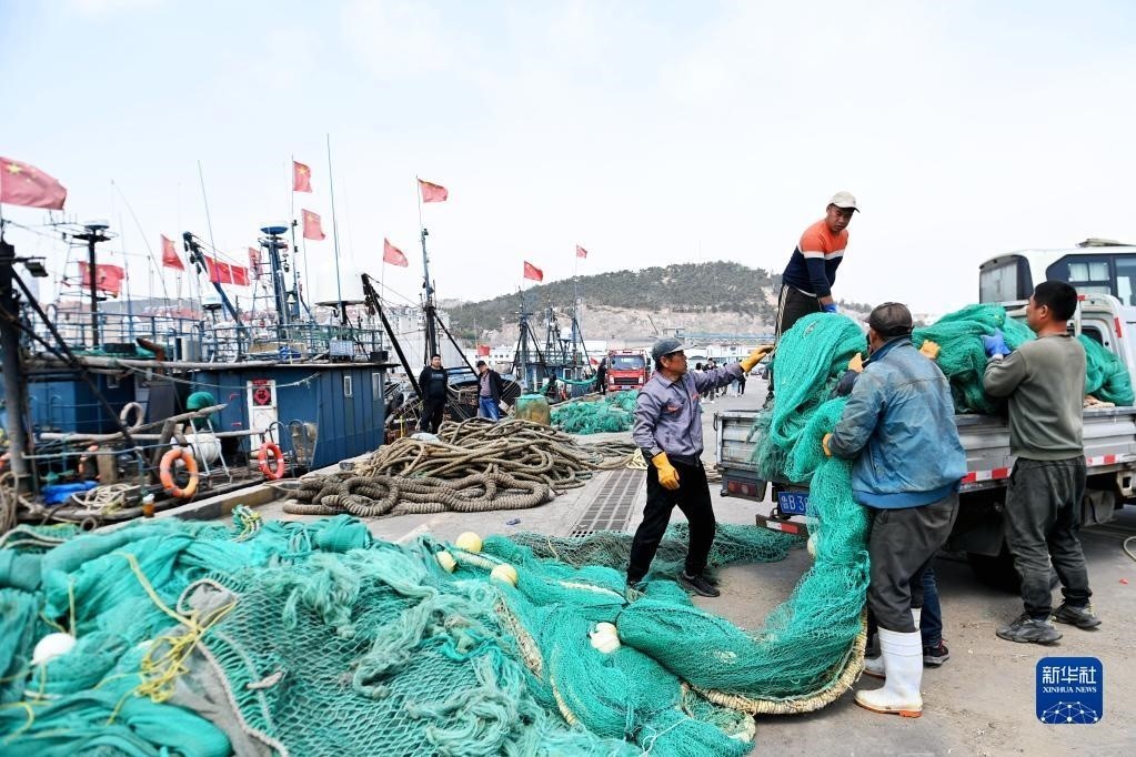 4月30日,在山東青島西海岸新區(qū)積米崖漁港,漁民在卸載漁船上的網(wǎng)具。   新華社發(fā)(俞方平 攝)