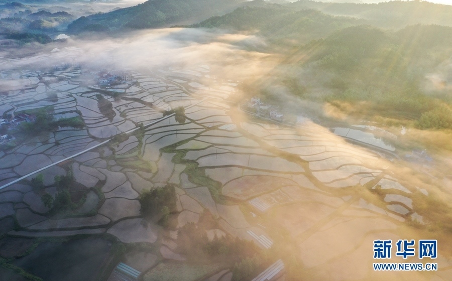 春日清晨,航拍安徽省宣城市旌德縣興隆鎮(zhèn)三山村,線條優(yōu)美的梯田、若隱若現(xiàn)的村莊、濃淡相宜的云霧、變幻莫測的朝霞,描繪出一幅幅美麗的鄉(xiāng)村畫卷。