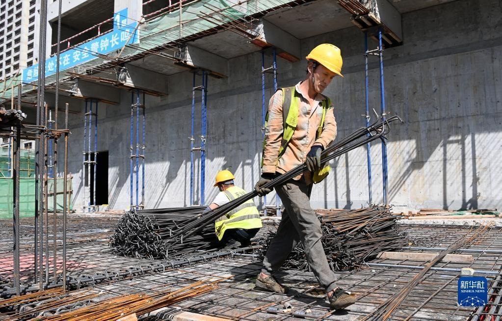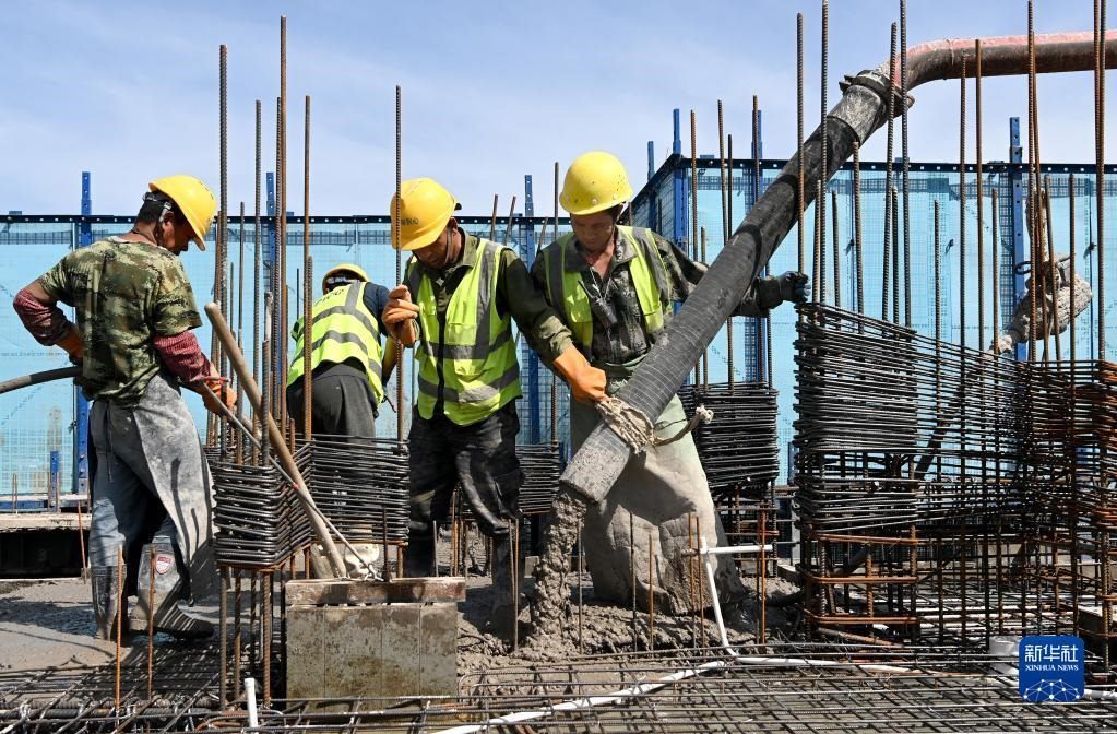 5月1日,在浙江省杭州市臨平區(qū)一個項目工地,中建三局的建設(shè)者在施工中。